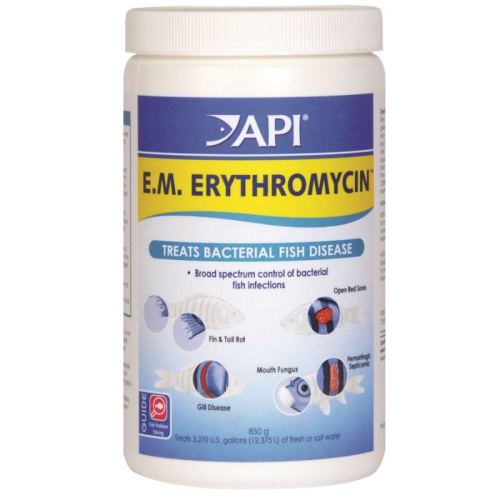 API E.M. Erythromycin Powder treats a broad range of bacterial fish infections including hemorrhagic septicemia, fin and tail rot, mouth fungus (cotton mouth), open red sores and bacterial gill disease in freshwater and saltwater aquariums. Powdered fish health remedies allow easy dosing for easier, faster, and more effective treatment.