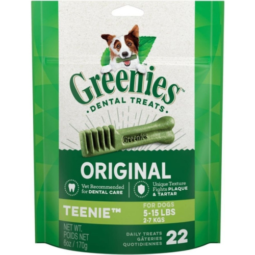 Greenies Teenie Dental Dog Treats are the Original Smart Treat! These delicious, safe and effective dental treats fight plaque and tartar buildup, maintain healthy teeth and gums, and provide fresh breath. With low fat and complete nutrition, they're great for daily feeding.